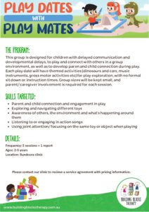 This group is designed for children with delayed communication and developmental delays, to play and connect with others in a group environment.
