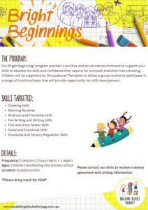 This program is designed for children going into prep, and covers skills such as fine and gross motor, social, emotional regulation, and school routine preparation.