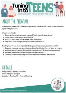 This program is designed to support and help parents teach their teenage children to control, understand, and express their emotions in a healthy and positive way. Tuning into teens helps parents recognise, understand, and respond to their teenagers emotions, which in turn helps them manage their one emotions.