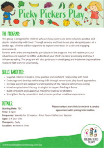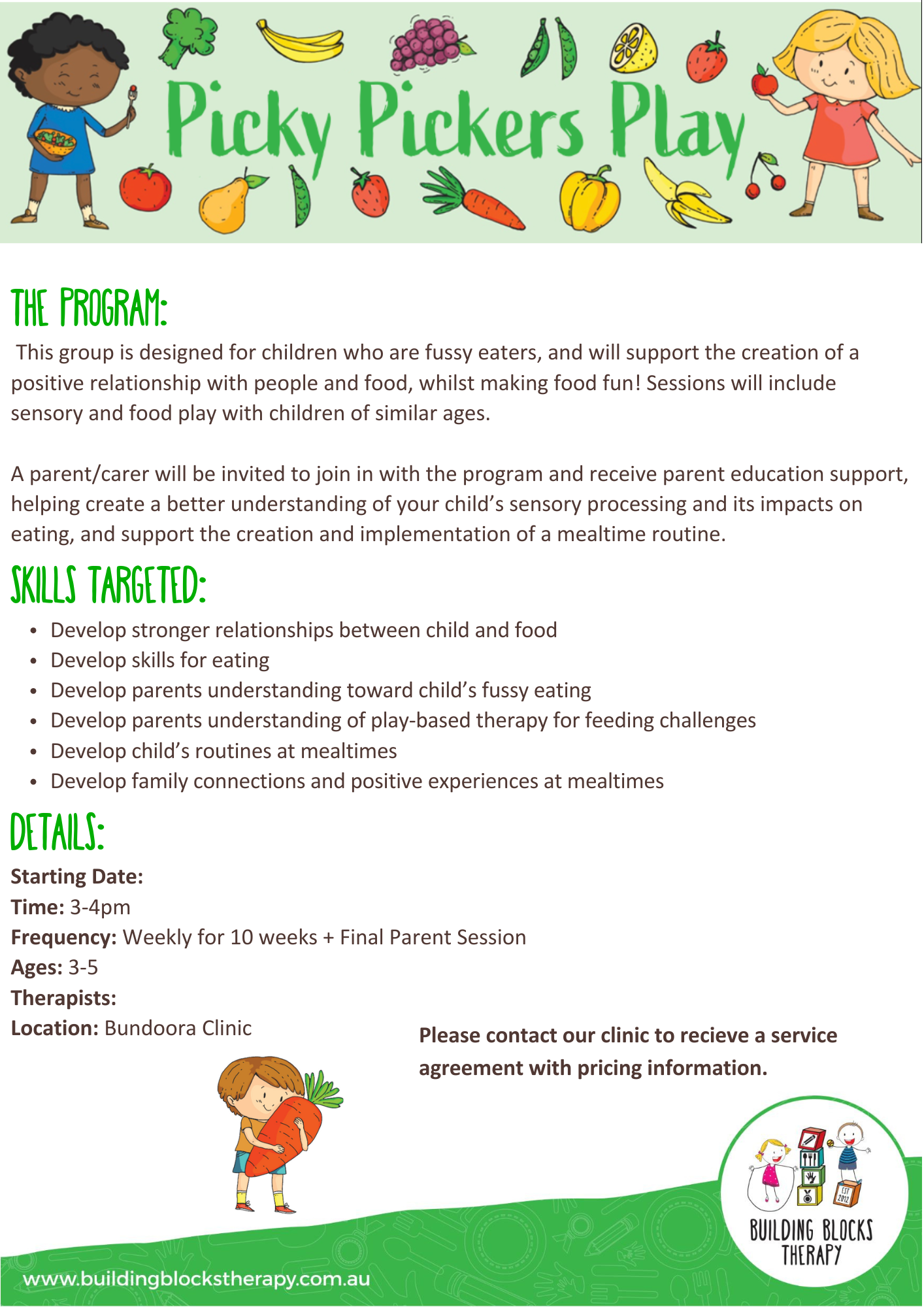 This program is designed for fussy eaters to support the creation of a positive relationship with people and food, whilst making food fun!